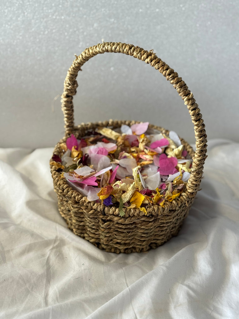 Needing the perfect basket to hold your loose or bagged confetti? This adorable round wicker basket could be just the one for you!