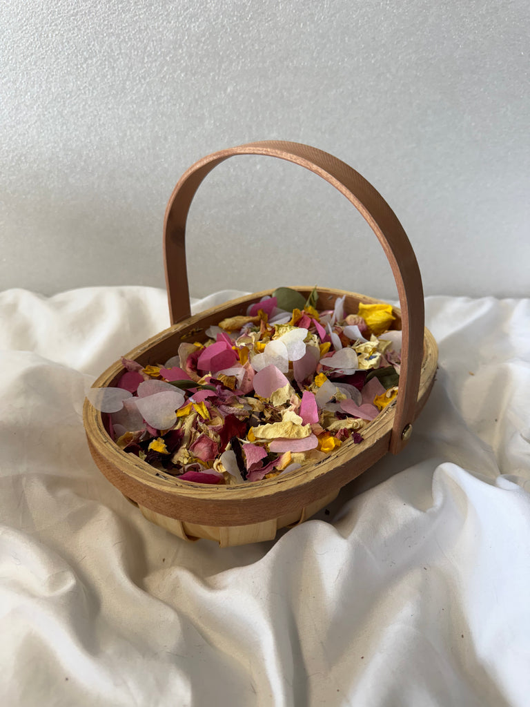A shallow tray basket, with a collapsible handle, is an adorable way to contain all of your natural and biodegradable confetti from us!